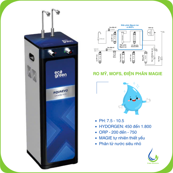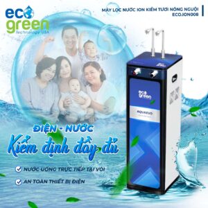 Máy lọc nước ion kiềm nóng nguội điện phân Magie cực tan Eco Green tạo ra nguồn nước ion kiềm giàu hydrogen, đáp ứng tiêu chuẩn khắt khe về chất lượng nước uống của Bộ Y tế. Đặc biệt, ECO.ION008 (R2) loại máy chuyên dụng cho nguồn nước đầu vào có pH thấp (pH <6,5).