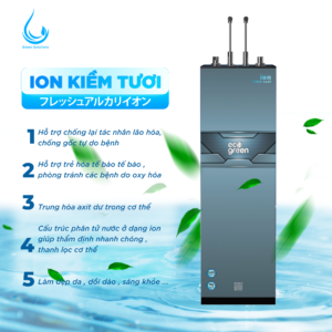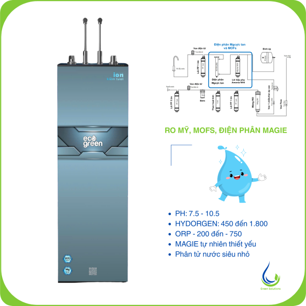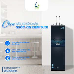 Máy lọc nước ion kiềm nóng nguội lạnh phân Magie cực tan Eco Green tạo ra nguồn nước ion kiềm giàu hydrogen, đáp ứng tiêu chuẩn khắt khe về chất lượng nước uống của Bộ Y tế. Đặc biệt ECO.ION021 (R2) loại máy chuyên dụng cho nguồn nước đầu vào có pH thấp (pH <6,5).