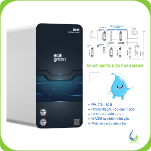 Máy chuyển đổi ion kiềm điện phân Magie cực tan Eco Green tạo ra nguồn nước ion kiềm giàu hydrogen, đáp ứng tiêu chuẩn khắt khe về chất lượng nước uống của Bộ Y tế. Đặc biệt, ECO.ION013 R2 loại máy chuyên dụng cho nguồn nước đầu vào có pH thấp (pH <6,5).